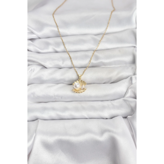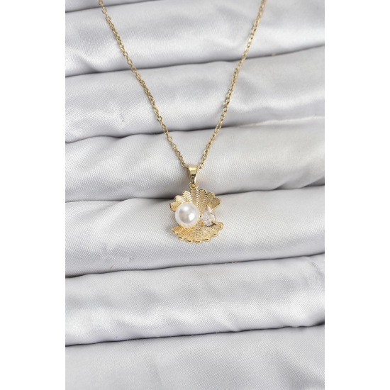 Mey İthalat® 316L Çelik Zincir Gold Renk İstiridye İnci Model Zirkon Taşlı Kadın Kolye