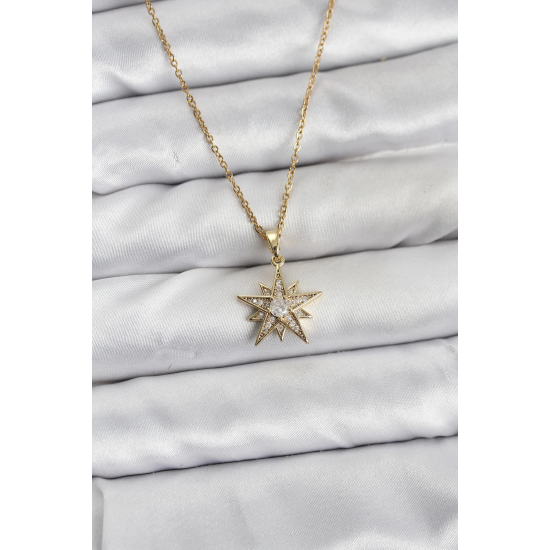 Mey İthalat® 316L Çelik Zincir Gold Renk Yıldız Model Zirkon Taşlı Kadın Kolye