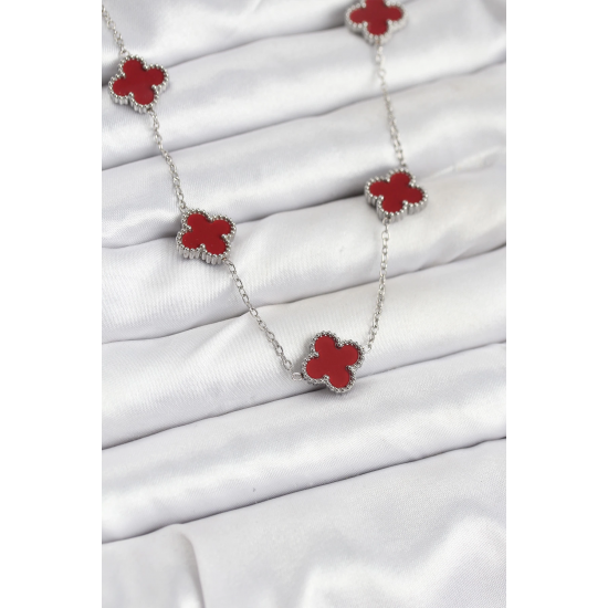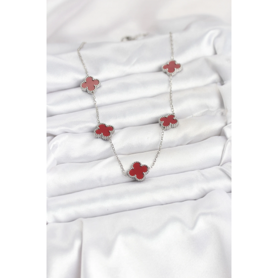 Mey İthalat® 316L Çelik Zincir Gümüş Renk Bordo Renk Yonca Kadın Kolye