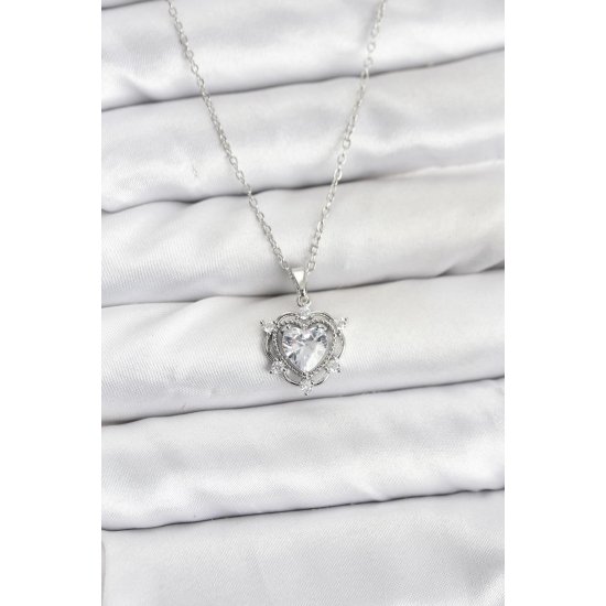 Mey İthalat® 316L Çelik Zincir Gümüş Renk Kalp Model Zirkon Taşlı Kadın Kolye