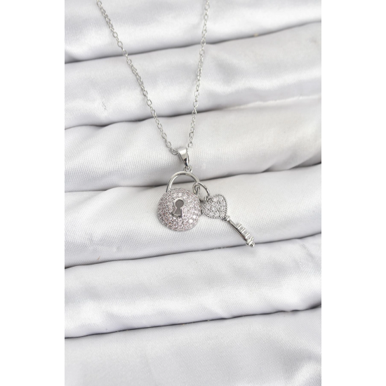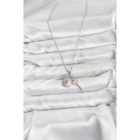 Mey İthalat® 316L Çelik Zincir Gümüş Renk Kilit Anahtar Model Zirkon Taşlı Kadın Kolye