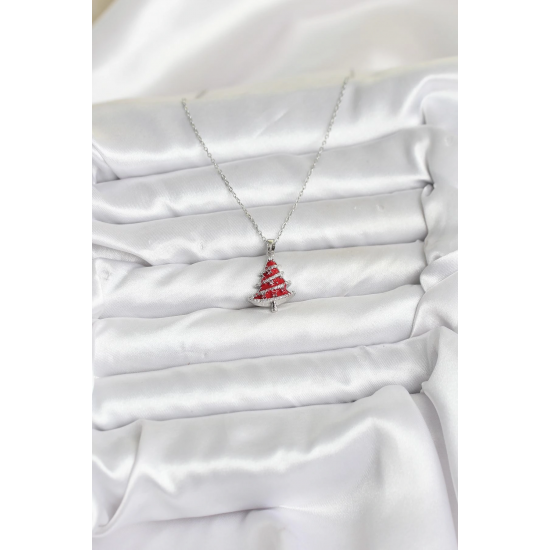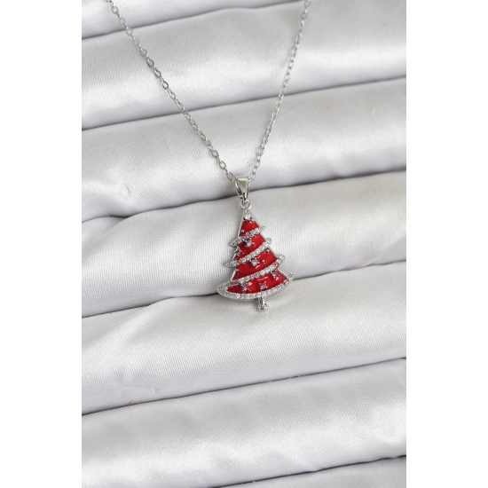 Mey İthalat® 316L Çelik Zincir Gümüş Renk Kırmızı Çam Ağacı Model Yılbaşı Temalı Kadın Kolye