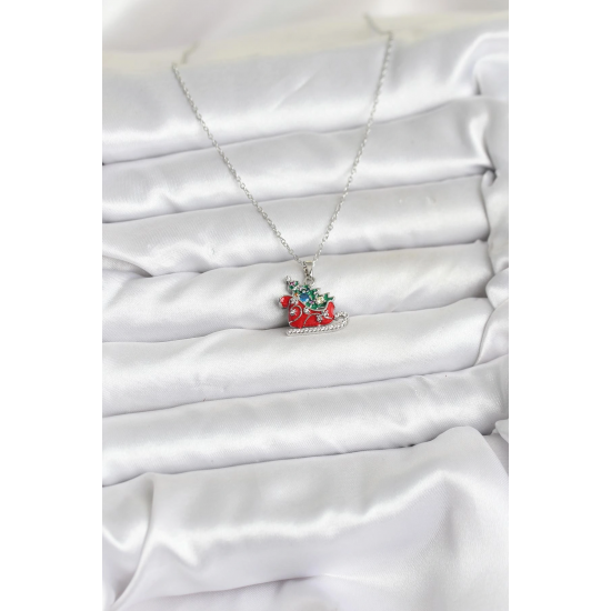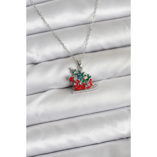 Mey İthalat® 316L Çelik Zincir Gümüş Renk Kızak ve Çam Ağacı Figürlü Yılbaşı Temalı Kadın Kolye