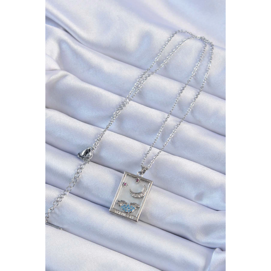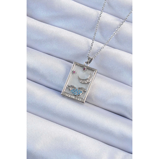 Mey İthalat® 316L Çelik Zincir Gümüş Renk Zirkon Taşlı Ay Figürlü Tarot Kolye