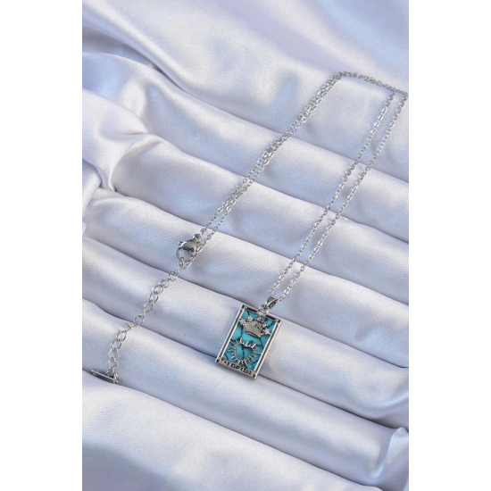 Mey İthalat® 316L Çelik Zincir Gümüş Renk Zirkon Taşlı Mavi Mermer Desenli Taç Model Tarot Kolye