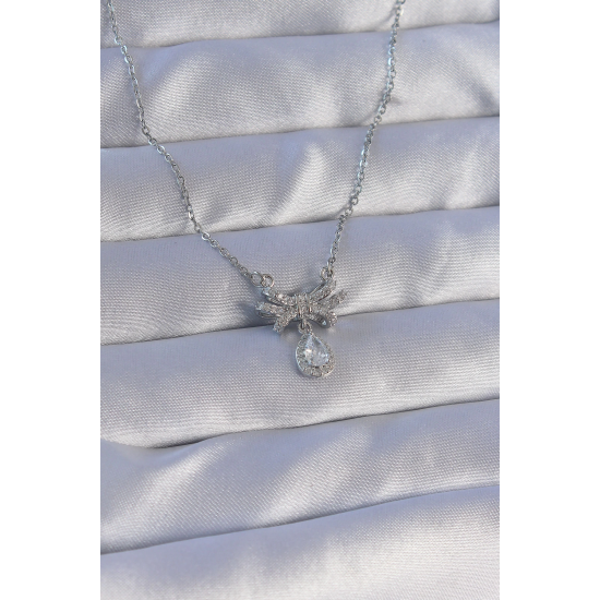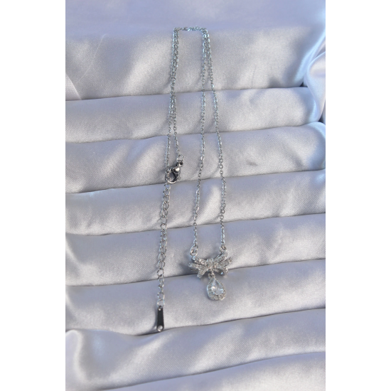 Mey İthalat® 316L Çelik Zincirli Gümüş Renk Zirkon Taşlı Damla Detay Fiyonk Model Kolye