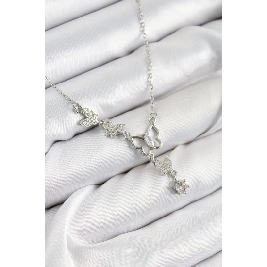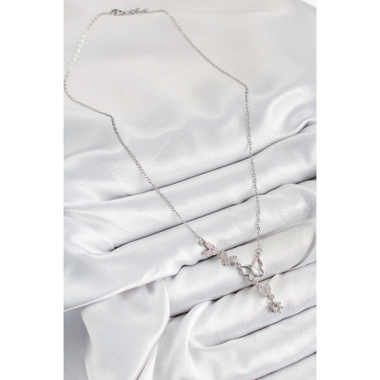 Mey İthalat® 316L Çelik Zirkon Taşlı Kelebek Model Gümüş Renk Kadın Kolye