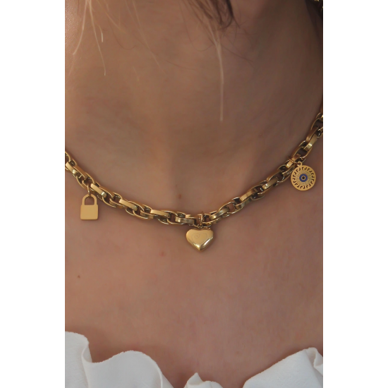 Mey İthalat® Çelik Gold Renk Kalın Zincir Model Kalp Figür Kadın Kolye