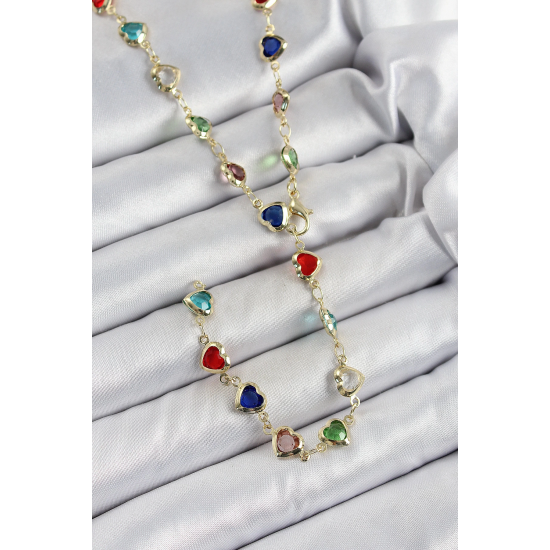 Mey İthalat® Pirinç Gold Renk Karışık Renk Zirkon Taşlı Kalpli Y Kadın Kolye
