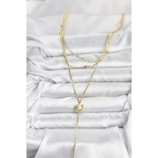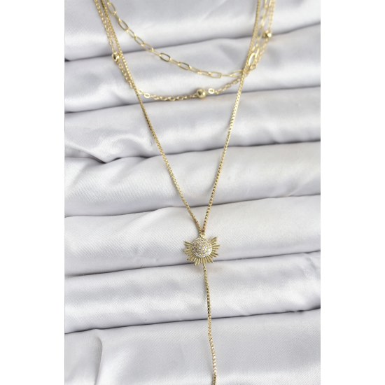 Mey İthalat® Pirinç Gold Renk Zirkon Taşlı Güneş Model Detaylı 3'lü Kombin Y Kadın Kolye