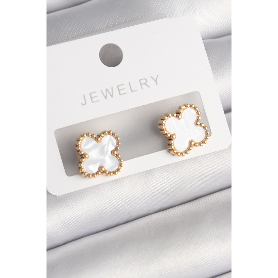 Mey İthalat® 316L Çelik Gold Renk Beyaz Minelik Yonca Model Kadın Küpe