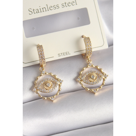 Mey İthalat® Pirinç Gold Renk Zirkon Taşlı Göz Model Kadın Küpe