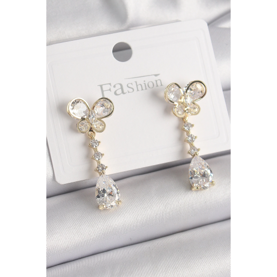 Mey İthalat® Pirinç Gold Renk Zirkon Taşlı Kelebek Model Sallantı Damla Zirkon Taş Kadın Küpe