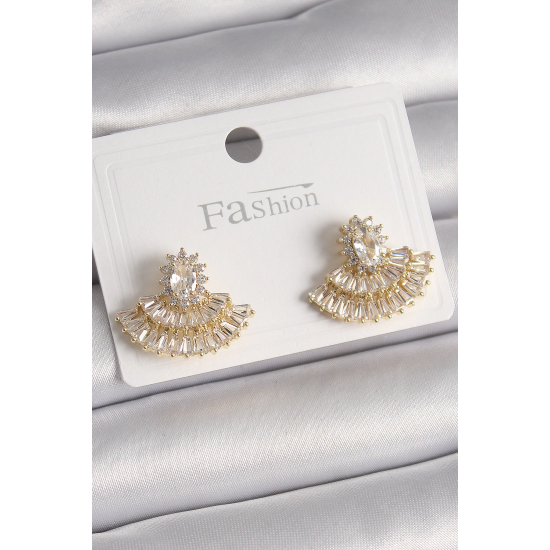 Mey İthalat® Pirinç Gold Renk Zirkon Taşlı Yelpaze Model Kadın Küpe