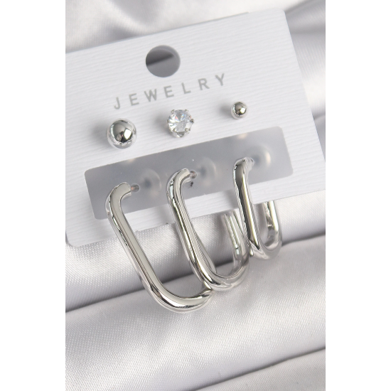 Mey İthalat® Pirinç Gümüş Renk Halka Model Zirkon Taşlı Topçuk Detay Kadın Küpe Seti