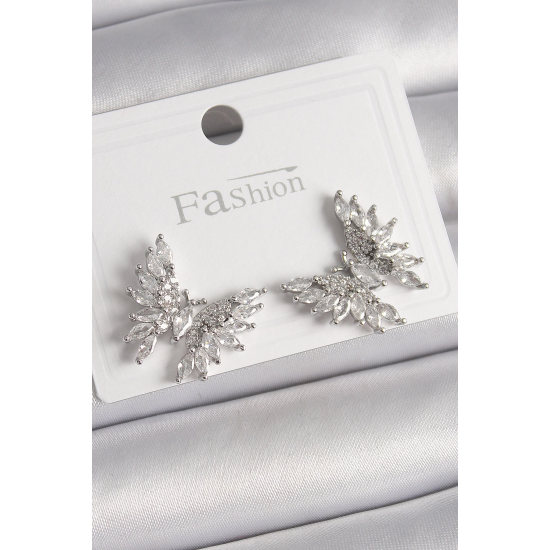 Mey İthalat® Pirinç Gümüş Renk Zirkon Taşlı Kelebek Model Kadın Küpe