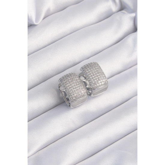 Mey İthalat® Pirinç Gümüş Renk Zirkon Taşlı Minimal Halka Küpe