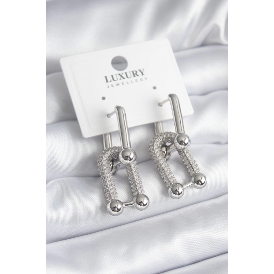Mey İthalat® Pirinç Gümüş Renk Zirkon Taşlı Model VIP Seri Kadın Küpe