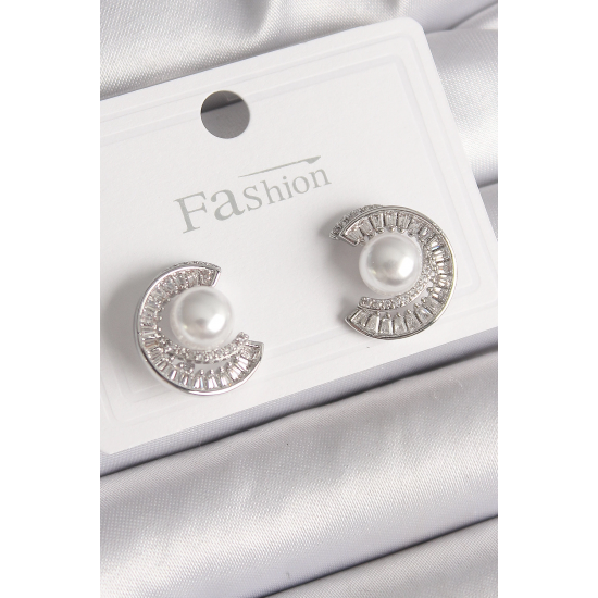 Mey İthalat® Pirinç Gümüş Renk Zirkon Taşlı Salyangoz Model İnci Detay Kadın Küpe