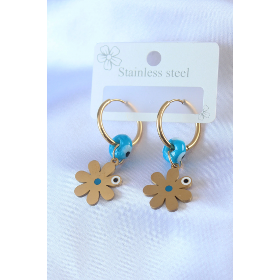 Mey İthalat® 316L Çelik Gold Renk Çiçek Model Nazar Boncuk Detay Kadın Küpe