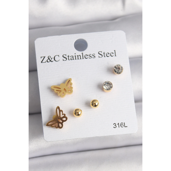 Mey İthalat® 316L Çelik Gold Renk Zirkon Taşlı Kelebek Figür Kadın Küpe Seti