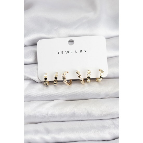 Mey İthalat® Gold Renk Pirinç Minimal Kalp Detaylı Kadın Küpe Seti