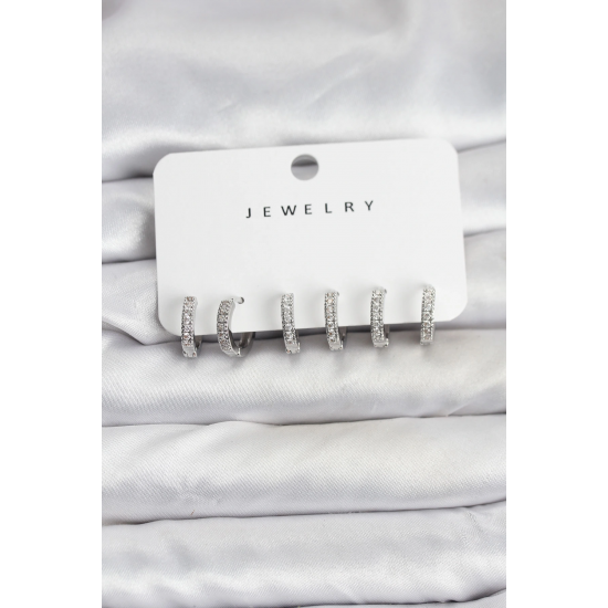 Mey İthalat® Gümüş Renk Pirinç Zirkon Taşlı Halka Kadın Küpe Seti