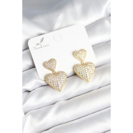 Mey İthalat® Kalp Model Zirkon Taşlı Gold Renk Pirinç Kadın Küpe