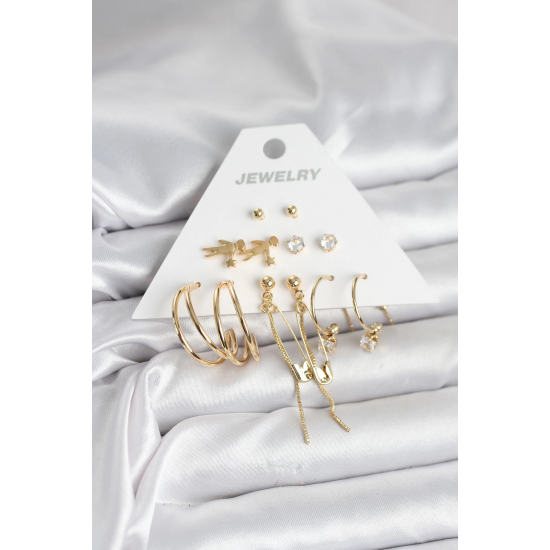 Mey İthalat® Pirinç Gold Renk 6 Çiftli Kadın Küpe Seti