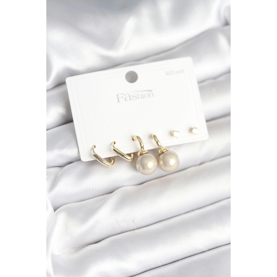 Mey İthalat® Pirinç Gold Renk İnci Detaylı 925 Gümüş Çivili Kadın Küpe Seti