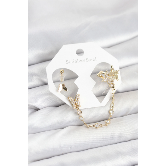 Mey İthalat® Pirinç Gold Renk Kelebek Model Zincir Bağlantılı Ear Cuff Küpe Seti