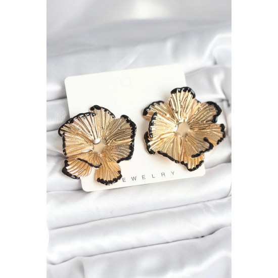 Mey İthalat® Pirinç Gold Renk Siyah Mine Detaylı Lotus Kadın Küpe