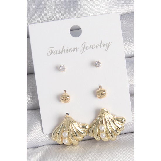 Mey İthalat® Pirinç Gold Renk Zirkon Taşlı İnci Detaylı Deniz Kabuğu Model 3 Çift Kadın Küpe Seti