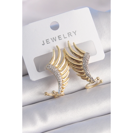 Mey İthalat® Pirinç Gold Renk Zirkon Taşlı Kanat Model Kadın Küpe