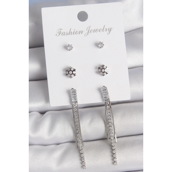 Mey İthalat® Pirinç Gold Renk Zirkon Taşlı Sallantılı Çiçek Detay 3 Çfit Kadın Küpe Seti