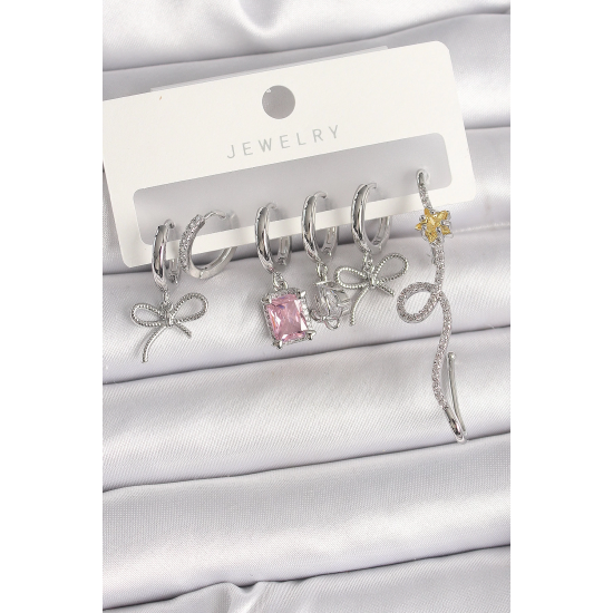 Mey İthalat® Pirinç Gümüş Renk Sallantı Kurdele Kuyruklu Yıldız Figür Pembe Kare Zirkon Taş Detay Kadın Küpe Seti