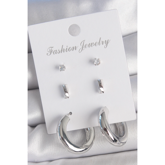 Mey İthalat® Pirinç Gümüş Renk Zirkon Taş Detay Halka Model 3 Çift Kadın Küpe Seti