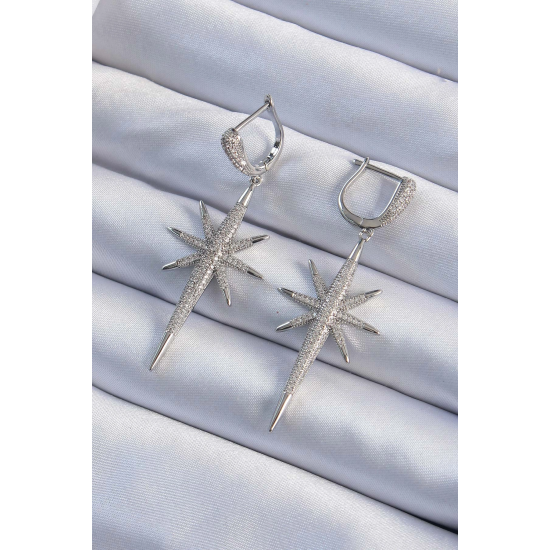 Mey İthalat® Pirinç Gümüş Renk Zirkon Taş Kaplama Kutup Yıldızı Tasarımlı Kadın Küpe