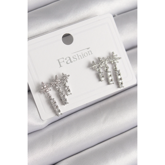 Mey İthalat® Pirinç Gümüş Renk Zirkon Taşlı 3'Lü Sallantı Yıldız Model Kadın Küpe