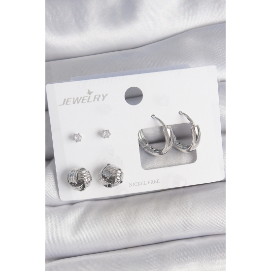 Mey İthalat® Pirinç Gümüş Renk Zirkon Taşlı Halka Model 3 Çift Kadın Küpe Seti
