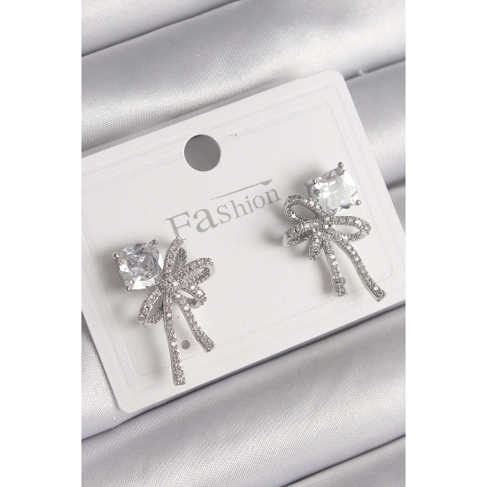 Mey İthalat® Pirinç Gümüş Renk Zirkon Taşlı Kurdele Model Kadın Küpe