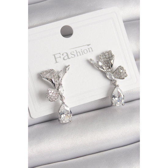 Mey İthalat® Pirinç Gümüş Renk Zirkon Taşlı Turna Kuşu Model Sallantı Detay Kadın Küpe