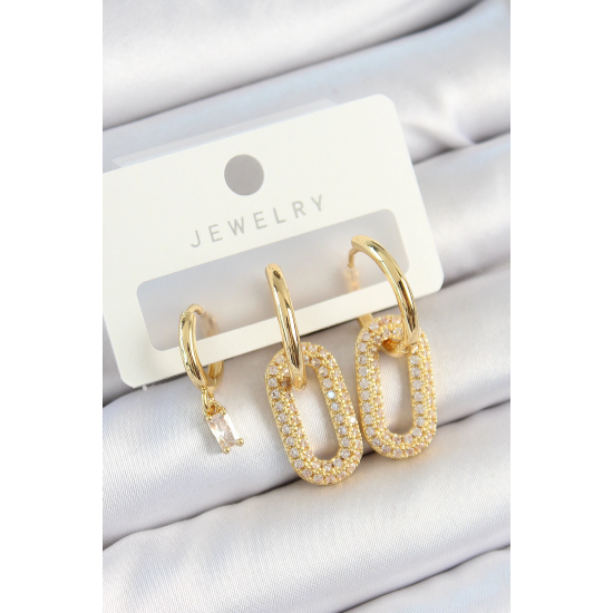 Mey İthalat® Pirinç Zirkon Taşlı Dikdörtgen Model Gold Renk 3'lü Çift Kadın Küpe Set