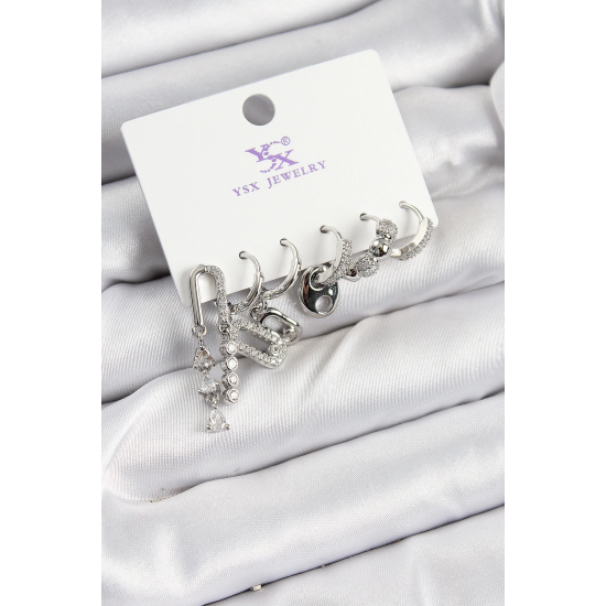 Mey İthalat® Pirinç Zİrkon Taşlı Dikdörtgen Model Gümüş Renk 3'lü Çift Kadın Küpe