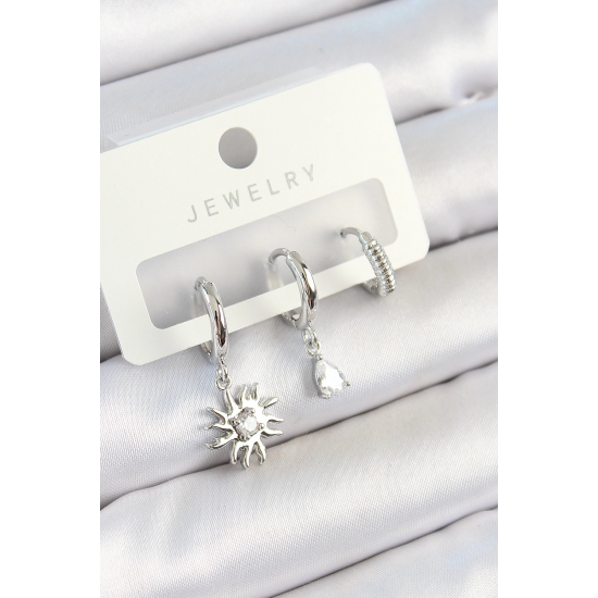 Mey İthalat® Pirinç Zirkon Taşlı Güneş Model Gümüş Renk 3'lü Çift Kadın Küpe Set