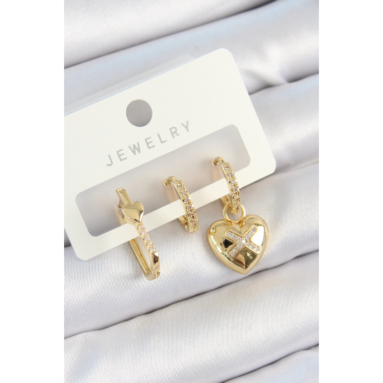 Mey İthalat® Pirinç Zirkon Taşlı Kalp Model Gold Renk 3'lü Çift Kadın Küpe Set