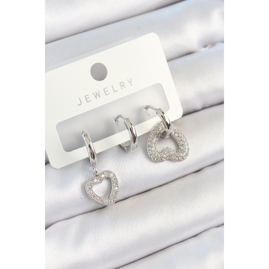 Mey İthalat® Pirinç Zirkon Taşlı Kalp Model Gümüş Renk 3'lü Çift Kadın Küpe Set