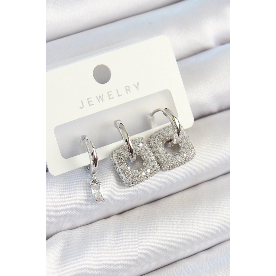 Mey İthalat® Pirinç Zirkon Taşlı Kare Model Gümüş Renk 3'lü Çift Kadın Küpe Set