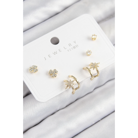 Mey İthalat® Pirinç Zirkon Taşlı Kutup Yıldızı Model Gold Renk 925 Ayar Gümüş Çivi Kadın Küpe Set