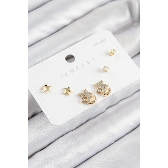 Mey İthalat® Pirinç Zirkon Taşlı Yıldız Model Gold Renk 925 Ayar Gümüş Çivi Kadın Küpe Set